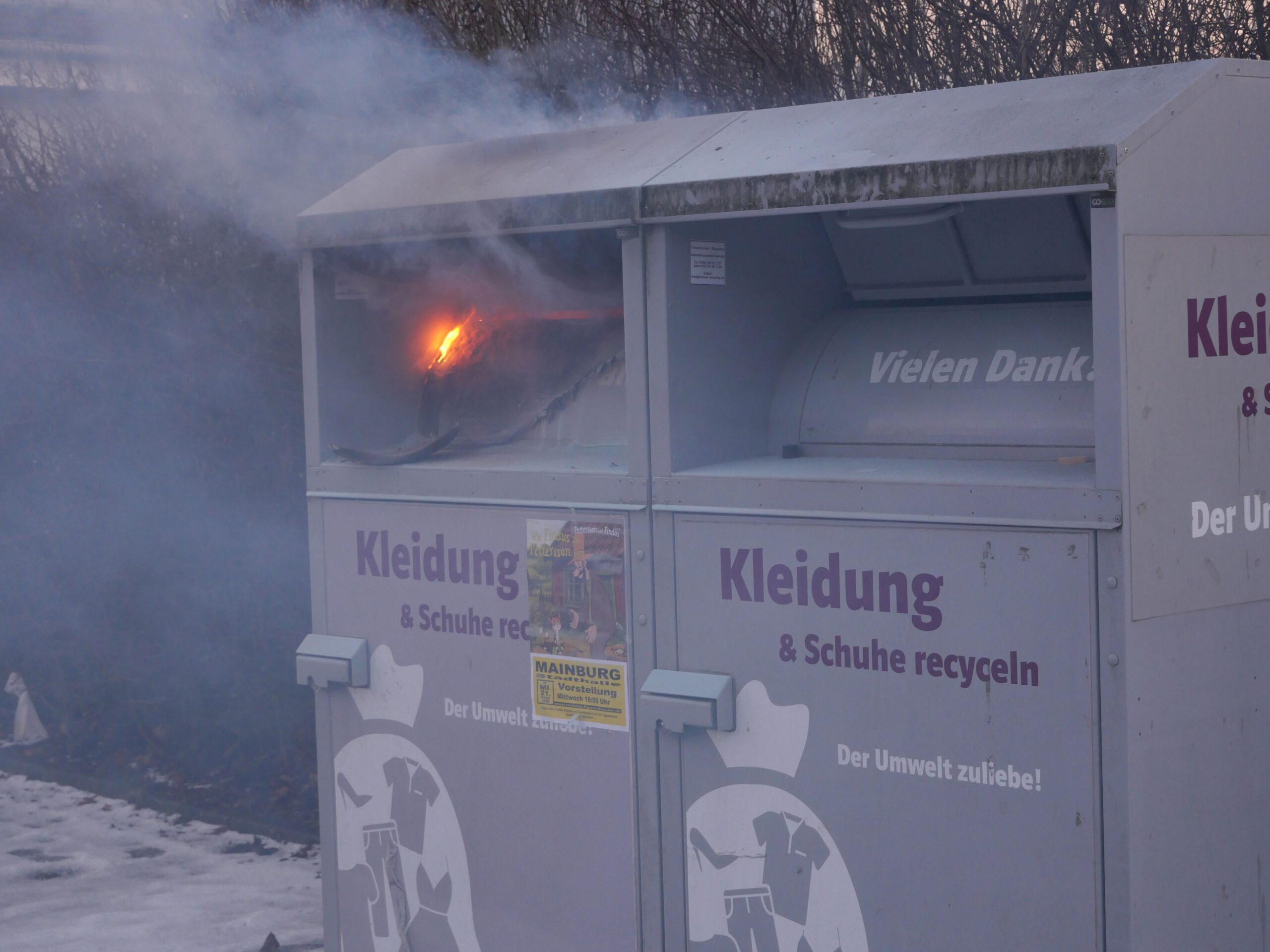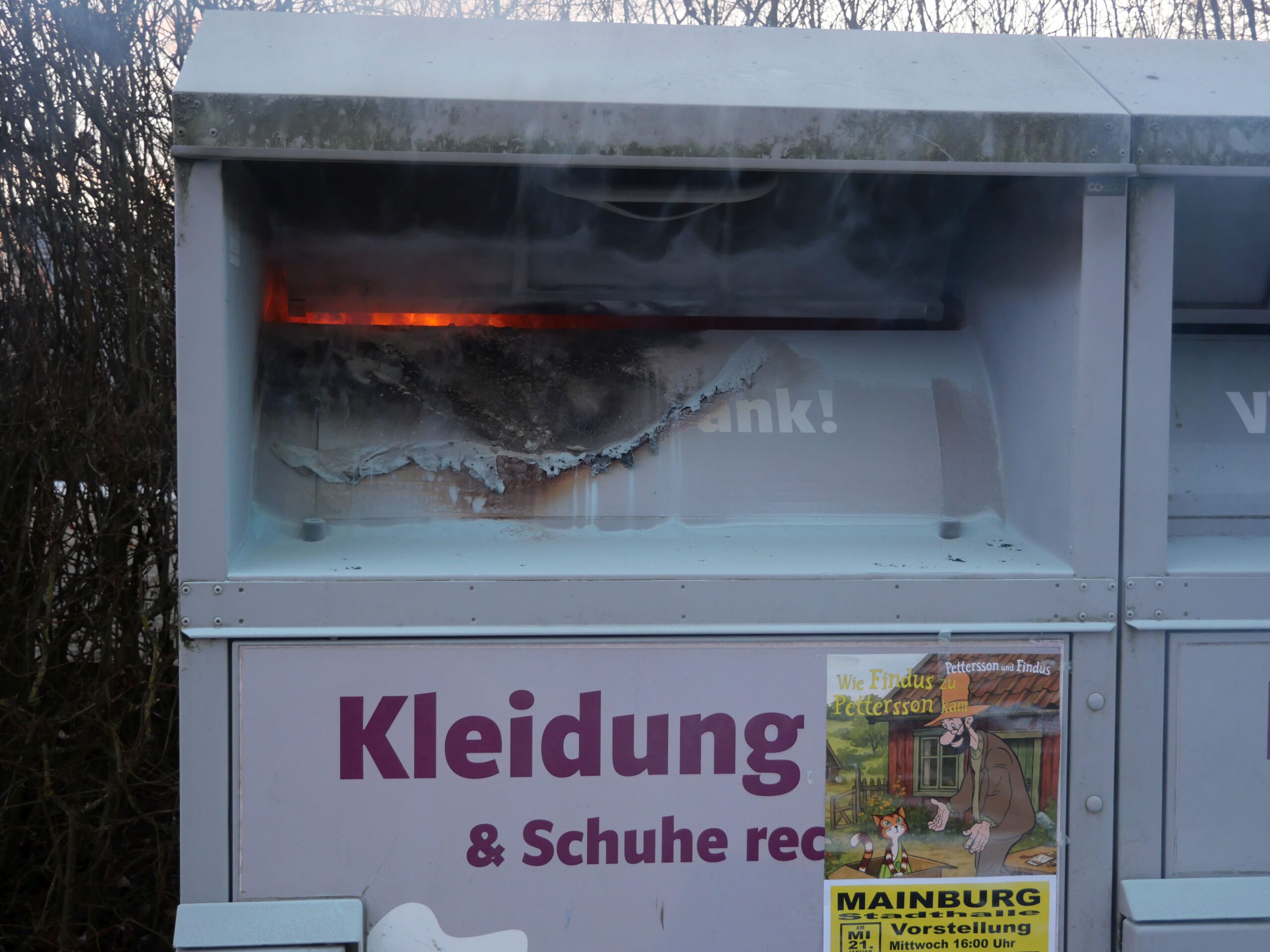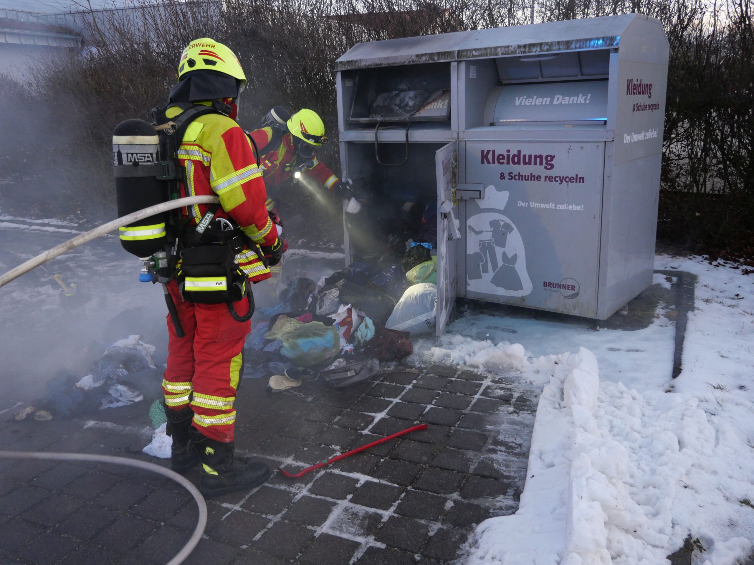 Ein Altkleidercontainer wurde durch Pyrotechnik in Brand gesetzt. Die Feuerwehr löschte den Brand und räumte den Container aus.