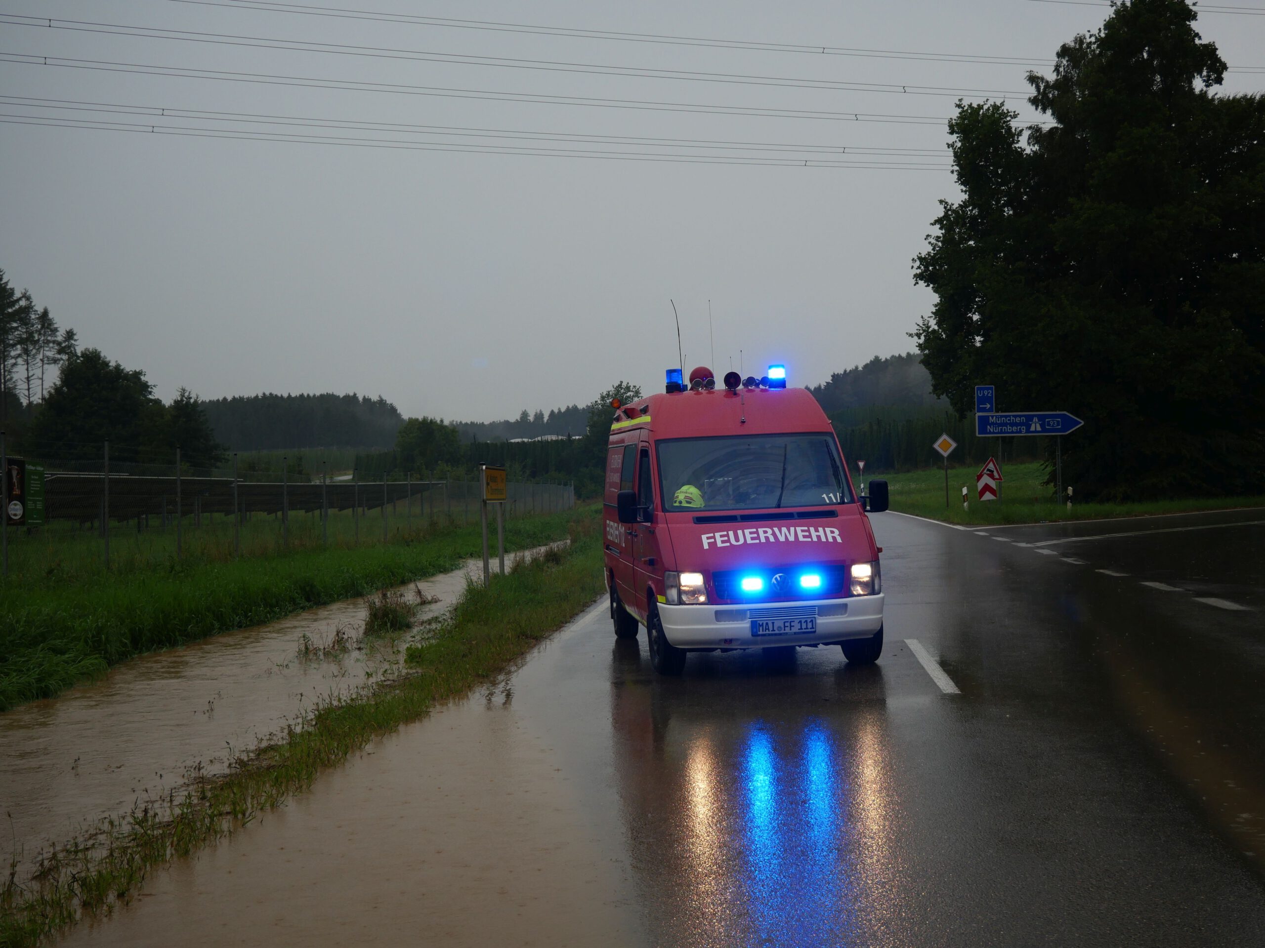 Durch den Starkregen war die Fahrbahn überschwemmt. Die Straße wurde durch die Feuerwehr gesperrt.