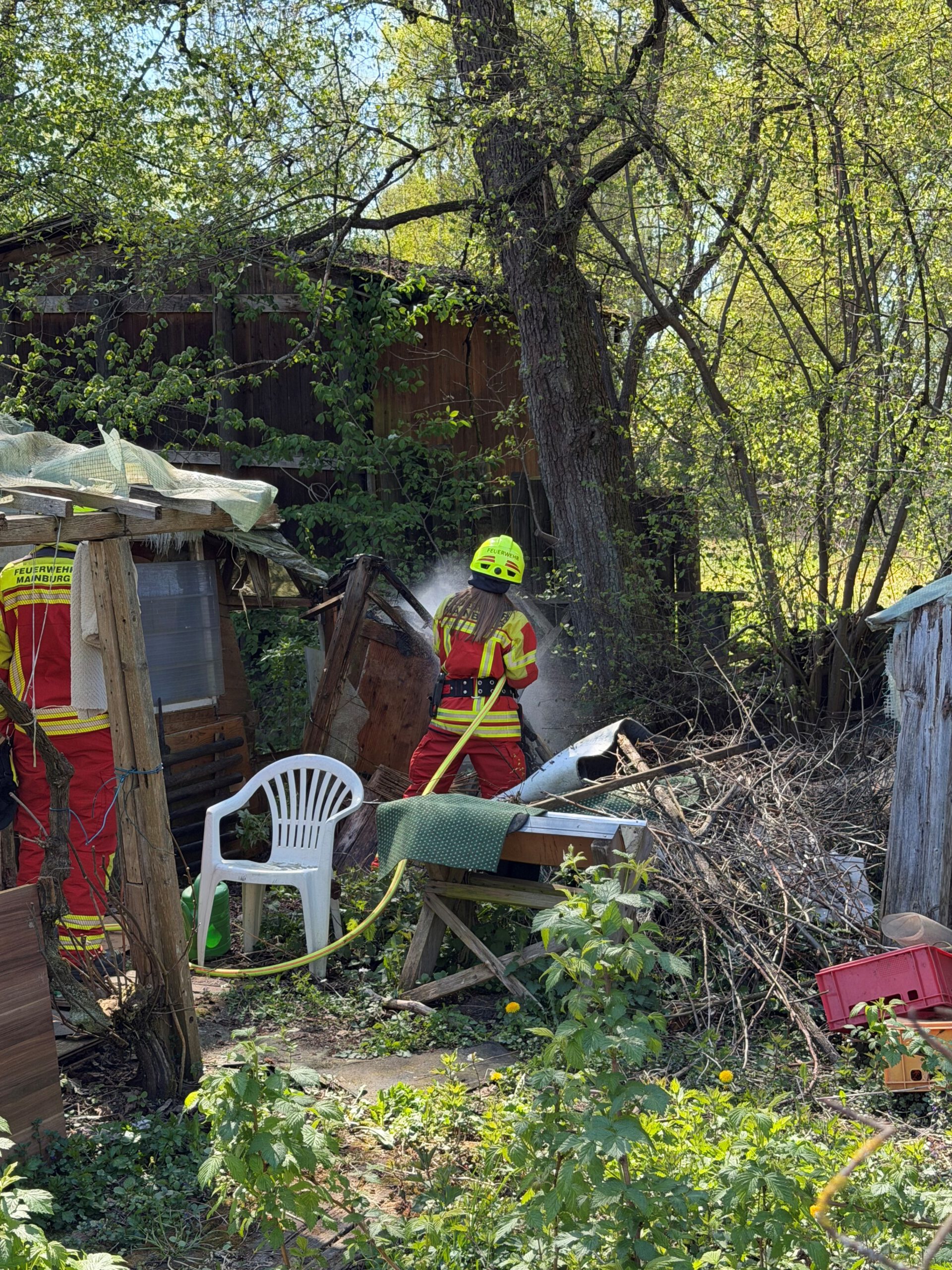 In einer Kleingartenanlage ist ein Anbau in Brand geraten. Das Feuer konnte durch die Anwesenden bereits eingedämmt werden. Die Feuerwehr kümmerte sich um die Nachlöscharbeiten mit dem Schnellangriff und der Wärmebildkamera.