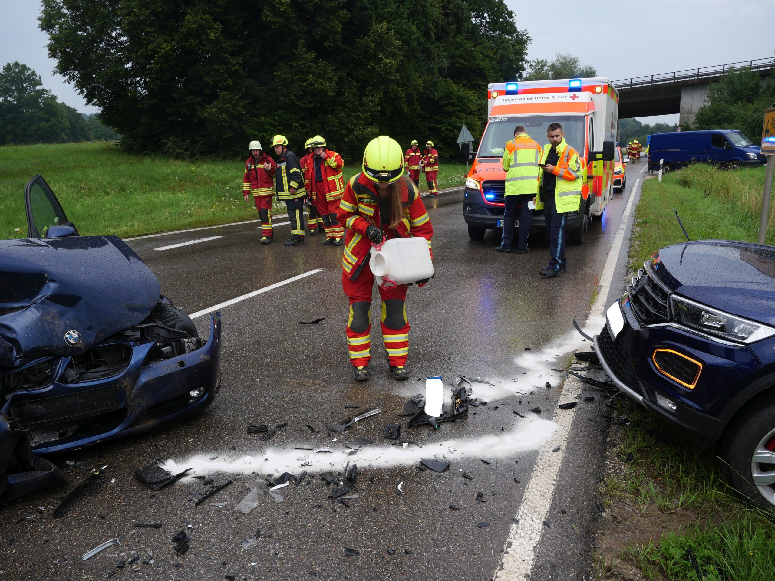 Zwei PKW waren verunfallt. Die Insassen konnten sich selber befreien und wurden vom Rettungsdienst versorgt. Die Straße wurde gesperrt und der Brandschutz sichergestellt.